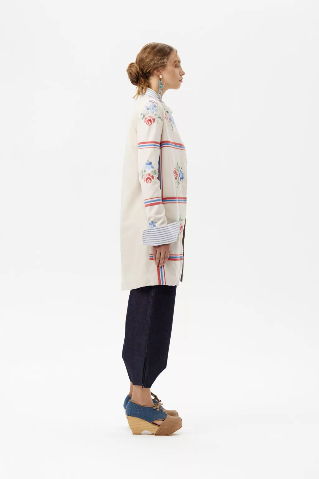 Confeccionado con mantel con guardas de bordado industrial. Luego bordado a mano en punto cruz con flores al tono de la misma época.